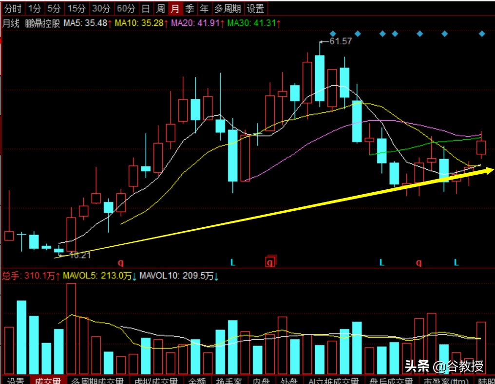2、鹏鼎控股:该股2018年上市后走出连续上涨行情,2020年10月创出高点61.57元后,开始回调,经过一年的调整,股价在今年9月企稳。月线图上可以看出,11月份呈跳空上涨走势,成交量伴随放大,上涨动能显著。技术上分析,该股在40元整数关口将进行震荡蓄势,一旦选择向上突破,大概率迎来又一波上涨行情。