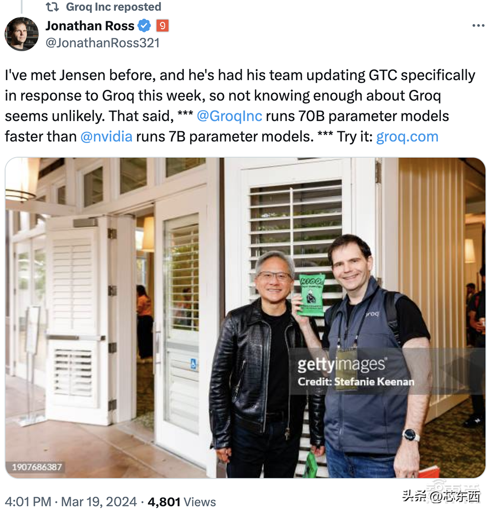 事情还没完,Groq创始人兼CEOJonathanRoss随即在社交平台上发文并晒出跟黄仁勋的合照:“我之前见过黄仁勋,他的团队本周专门更新了GTC,以回应Groq,所以对Groq不太了解似乎不太可能。也就是说,***Groq运行700亿参数模型的速度比英伟达运行70亿参数模型的速度快。***体验一下:”