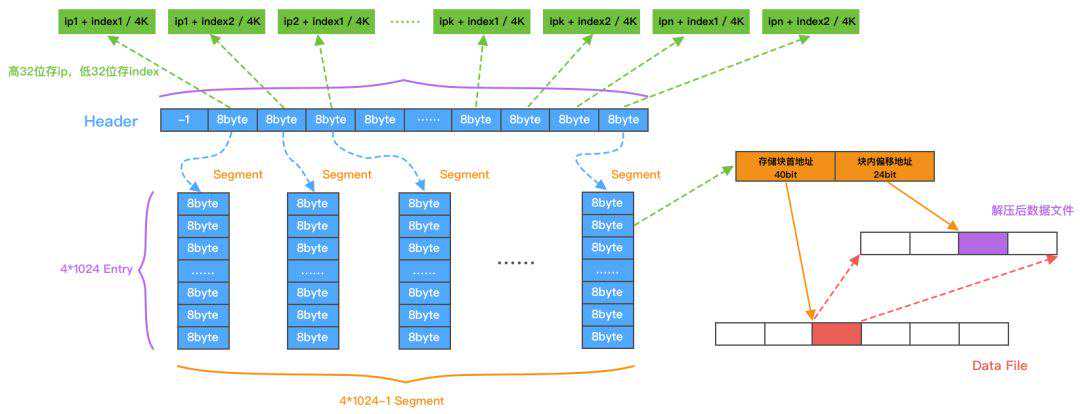 新版消息文件存储为了同时兼顾读写性能,引入了二级索引存储方案,对同一个应用的IP节点进行合并,并且保证一定的顺序存储。下图是索引结构的最小单元,每个索引文件由若干个最小单元组成。每个单元分为4*1024个桶,第一个桶作为我们的一级索引Header,存储IP、消息序列号与分桶的映射信息。剩余4*1024-1个桶作为二级索引,存储消息的地址。