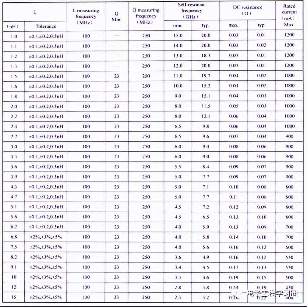 从上表中从左到右分别是电感的感值(nH)及精度范围(Tolerance)(测试感值时的频率,上表中为100MHz),Q值最小值(Qmin)、Q值测试时的频率、自谐振频率出现时的最小频率、电感直流电阻的最大值和典型值、额定电流,根据这些参数可以确定此类电感是否满足设计需求。