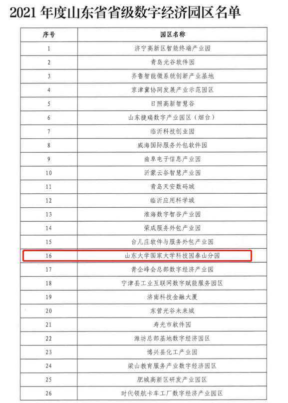 近日,山东省工信厅、山东省发展和改革委员会先后发文公布“2021年度山东省省级数字经济园区”和“2022年度山东省现代服务业集聚示范区”名单,山大泰山科技园继获得国家级众创空间、国家中小企业公共服务示范平台、省级小型微型企业创业创新示范基地等荣誉之后,再添两项省级荣誉。