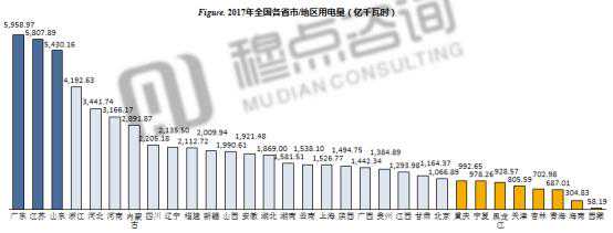 2017年,从全年累计用电量来看,广东省以5958.97亿千瓦时排第一,江苏省以5807.89亿千瓦时排在第二,山东省以5430.16亿千瓦时排在第三,其余省市自治区用电量均在5000亿千瓦时以下。