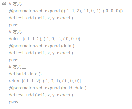 unittest测试框架,本身不支持参数化,但是可以通过安装unittest扩展插件rameterized来实现。