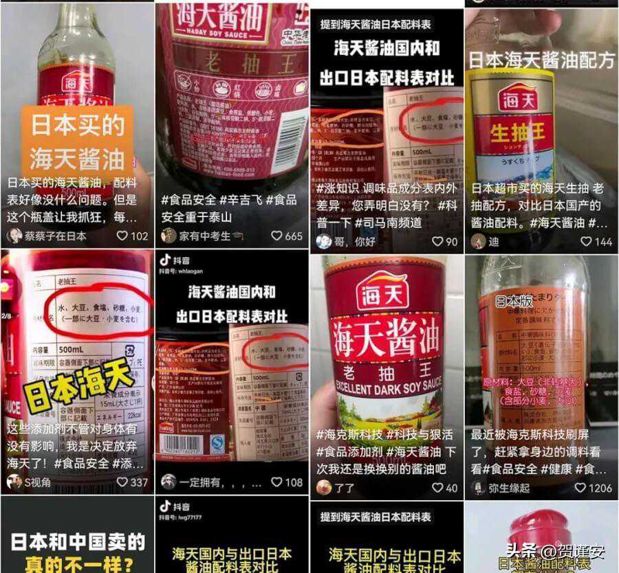 特意拿出一款出口日本的酱油作对比,声称海天集团“双标”,把勾兑酱油卖给国人,“0添加”的纯天然酱油卖给日本人。