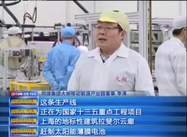 “这条生产线正在为国家‘十三五’重点工程项目——上海的地标性建筑拉斐尔云廊赶制太阳能薄膜电池。”大同大昶移动能源产业园工作人员向山西电视台记者表示,“一个125W的组件只有两公斤重,它的厚度只有2.5毫米,弱光性能非常好。在阴天我们的组件仍然可以发电;光电转化效率能够达到18.5%,在薄膜电池领域也是最为先进的。”