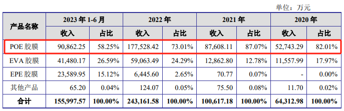 2023年上半年,祥邦科技EVA胶膜有关收入为4.15亿元,而2022年全年也才5.91亿元;祥邦科技2023年上半年EPE胶膜收入为2.36亿元,是2022年全年的3.66倍。