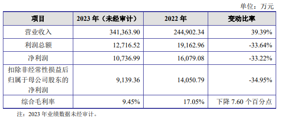 从全年来看,祥邦科技增收却降利的情况仍然存在。祥邦科技2023年全年未经审计的营业收入为34.14亿元,同比增长39.39%。但其净利润只有1.07亿元,同比下降33.22%。
