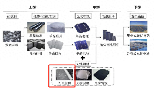 单体光伏电池机械强度差,容易破裂,空气中的水分和腐蚀性气体会逐渐氧化和锈蚀电极,无法承受露天工作的严酷条件,所以必须通过玻璃、胶膜、背板等辅材封装为光伏组件,才能对负载供电。整体而言光伏胶膜占光伏组件成本的比例为5%至8%,占光伏地面电站初始投资的比例为2%至3%。