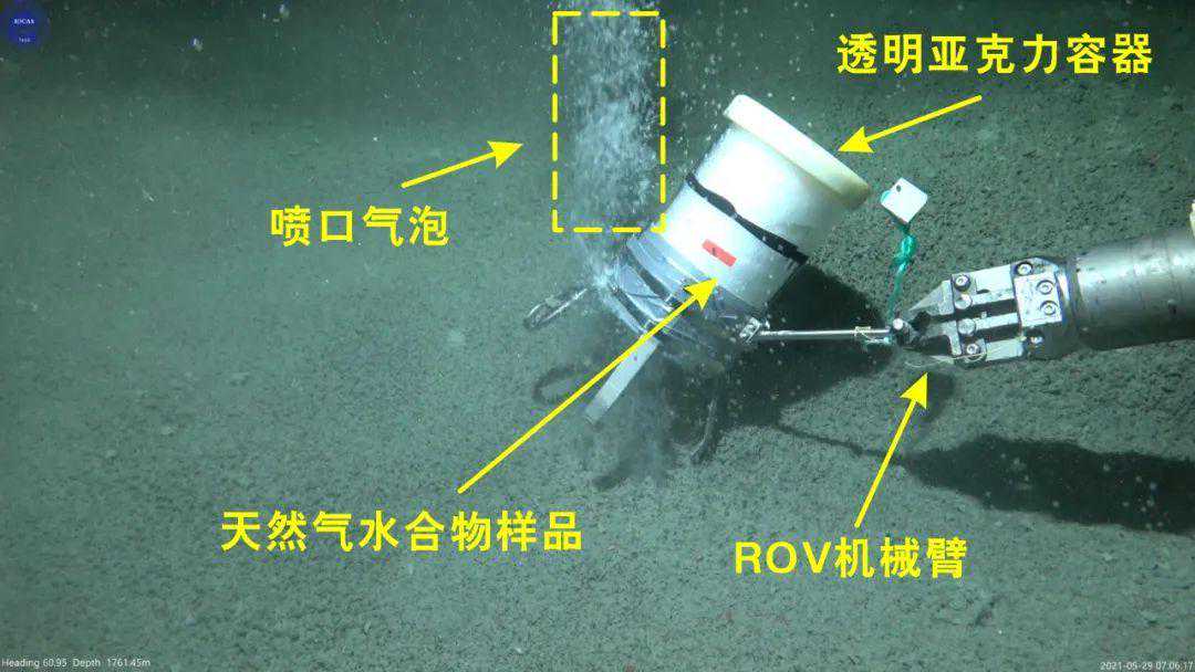 2021年6月,“科学”号在南海陵水冷泉区利用一个透明的底部开口的半封闭亚克力容器,在陵水活跃的冷泉喷口合成了一罐天然气水合物。在海底原位环境中,天然气水合物的形成是瞬时的。冷泉喷口喷出的甲烷气泡表面会迅速包裹上一层水合物膜,在遇到亚克力容器时逐渐堆积形成蜂窝状结构的天然气水合物样品。样品在海底静置一段时间后,利用ROV携带样品,模拟天然气水合物的上升过程,利用拉曼光谱技术和高清摄像头实时监测天然气水合物的相态与形貌变化过程。
