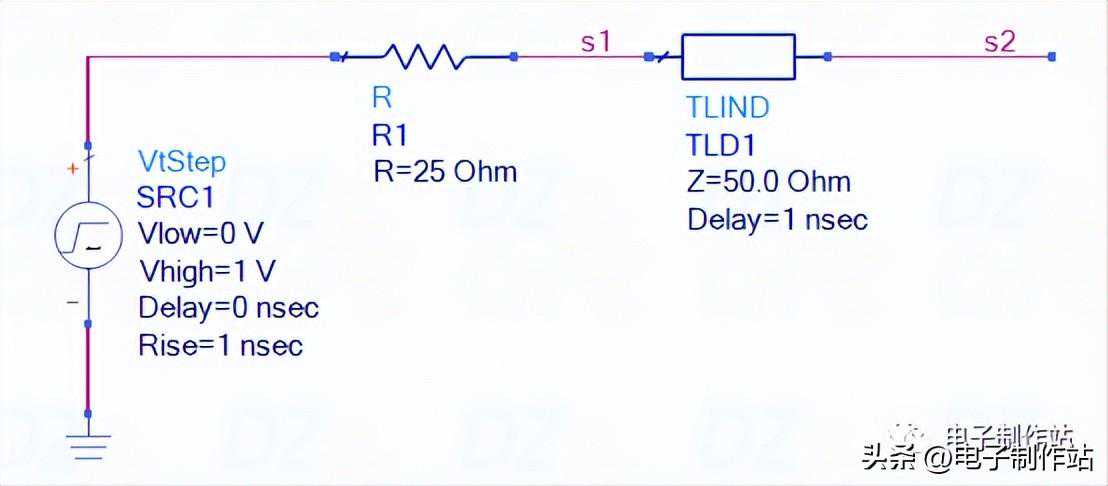 我们可以用ADS软件来仿真一下,相应的仿真电路如下图所示。其中,TLD1是一个可以指定特性阻抗与传播延时大小的传输线,此处保持默认的50欧姆与1ns,与《三极管》一书中一致。TLD1右侧未接负载(用高输入阻抗代替不匹配的终端),其左侧串联了一个25欧姆的电阻(R1),可以将其理解为信号源内阻,与传输线阻抗不相同(不匹配)。SRC1是一个阶跃信号源(幅值为1V,上升时间为1ns),用来模拟一个高速信号的上升沿。当然,也可以像《三极管》一书中使用时钟信号源。