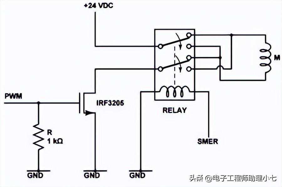 九、IRF3205继电器驱动电路下图为使用IRF3205MOSFET的继电器驱动电路,MOSFET接在线圈端地。