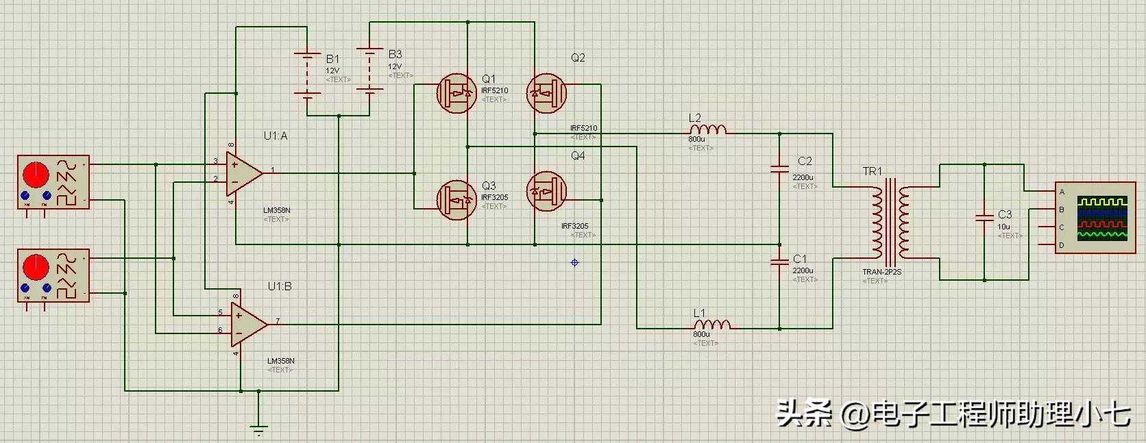 这里设计了这个Proteus模拟,将直流电压转换为交流电压,如果仔细观察,在H桥中使用了IRF3205MOSFET: