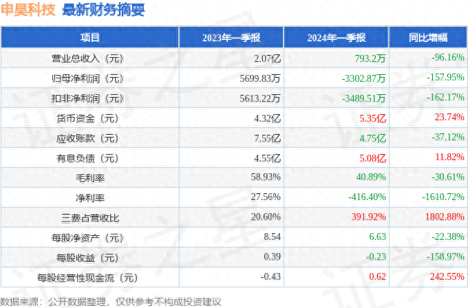 据证券之星公开数据整理,近期申昊科技(300853)发布2024年一季报。根据财报显示,本报告期中申昊科技净利润减157.95%,三费占比上升明显。截至本报告期末,公司营业总收入793.2万元,同比下降96.16%,归母净利润-3302.87万元,同比下降157.95%。按单季度数据看,第一季度营业总收入793.2万元,同比下降96.16%,第一季度归母净利润-3302.87万元,同比下降157.95%。