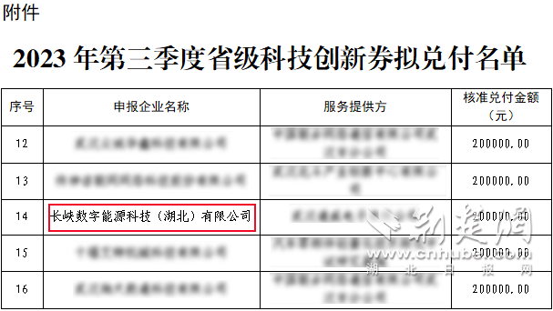 荆楚网(网)讯(通讯员龚苏)10月30日,湖北省科学技术厅、武汉市发展改革委员会相继发布《关于2023年湖北省支持高新技术企业发展专项资金(第一批)拟拨付企业的公示》、《省科技厅关于2023年第三季度湖北省科技创新券拟兑付名单公示》、《市发展改革委关于下达2023年市节能降碳和循环经济发展专项资金计划的通知》,长峡数能均在名单之列。
