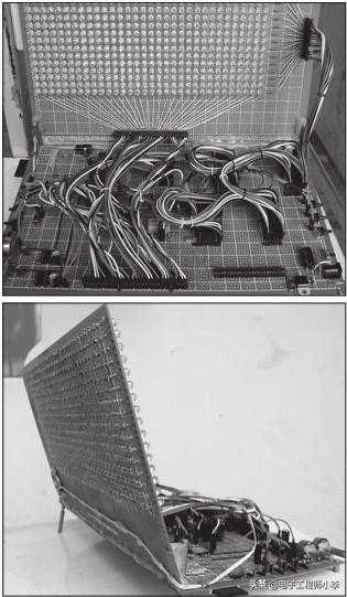 电路如图25.7所示。为了能有好的显示效果,显示部分用的是32×16的高亮度聚光蓝色LED组成的点阵屏,1kΩ电阻限流。全过程手工焊接,可能我焊得慢,整整焊了一晚上。焊接状态与电路细节如图25.8、图25.9所示。