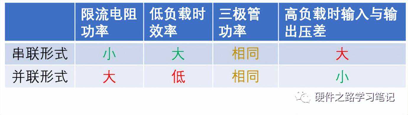 但串联形式与LDO一样需要保证一定的输入输出压差,而并联形式只需要调整限流电阻大小即可。
