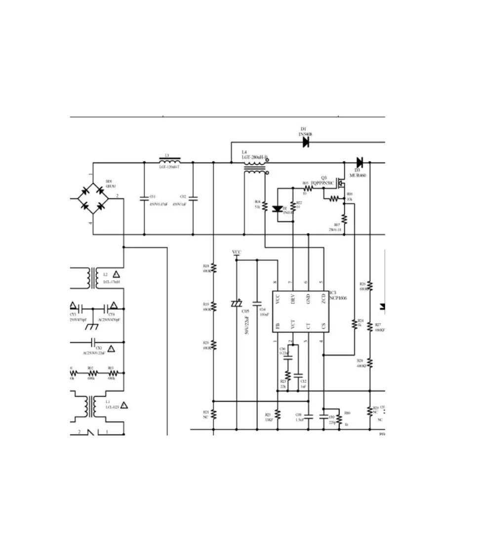 整个电路由5V待机电路,5Va主板数字供电电路,24V主电源逆变及伴音供电电路,欠压,过压,过流检测等电路组成。其中待机电路采用日本SANKE公司高可靠性电源方案STR-A6059H作为辅助电源,PFC与24V主电源分别采用了2块美国安森美公司的PWM驱动集成电路NCP1606,NCP1393组成。
