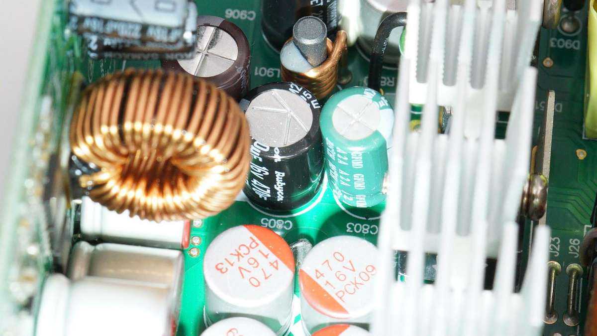 侧边设有PFC升压电感、两颗高压滤波电解电容以及滤波电感,散热片上固定有MOS管。
