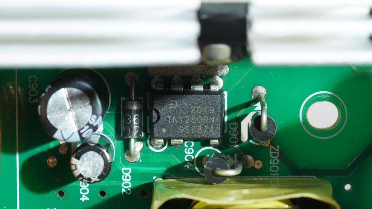 辅助电源控制器采用PITNY280P,这是一颗灵活性更高、功率范围更大的高效率离线式开关IC。芯片左侧设有供电电容和滤波电容。