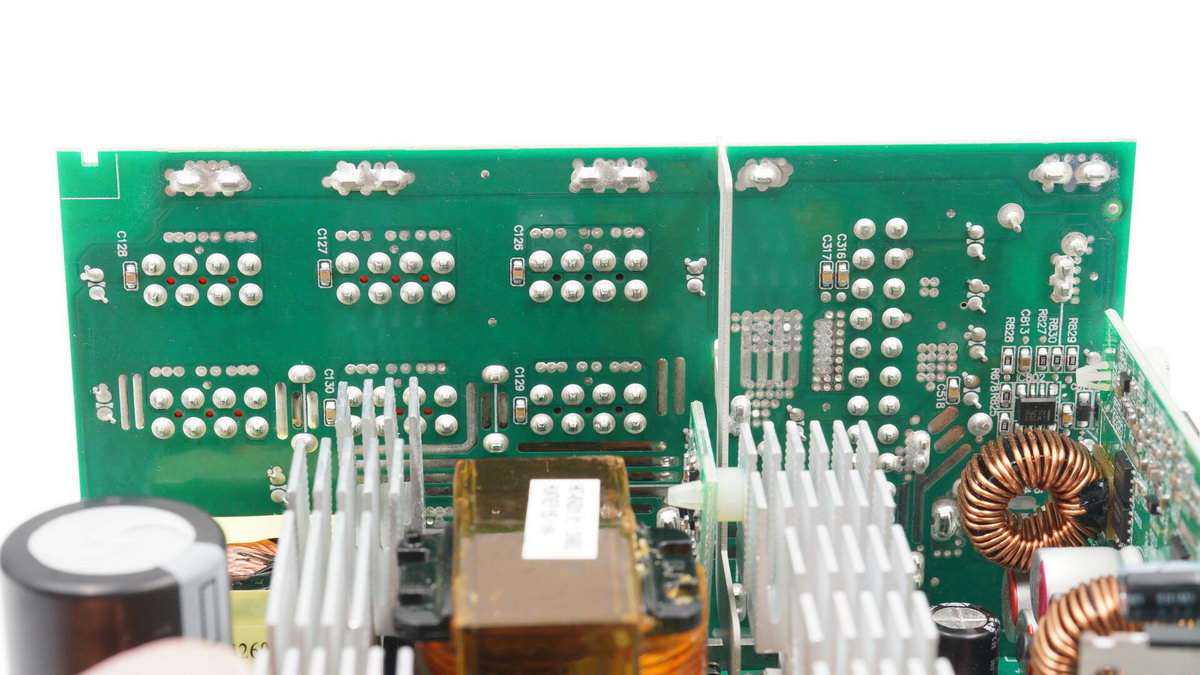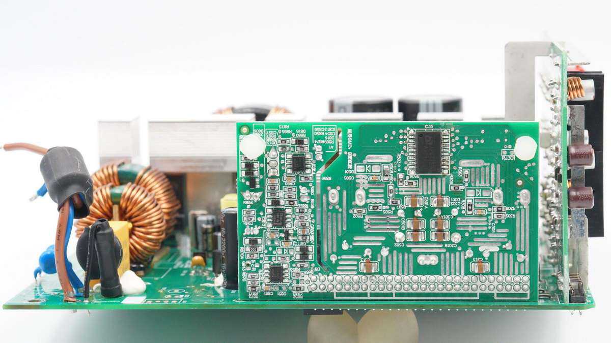 电源模块主板正面一览,最上端设有安规X电容和共模电感等,右侧设有PFC升压电路以及高压滤波电容等,中间设有辅助电源电路、变压器、同步整流输出电路,左侧焊接一块DC-DC二次降压小板,底部焊接输出小板。