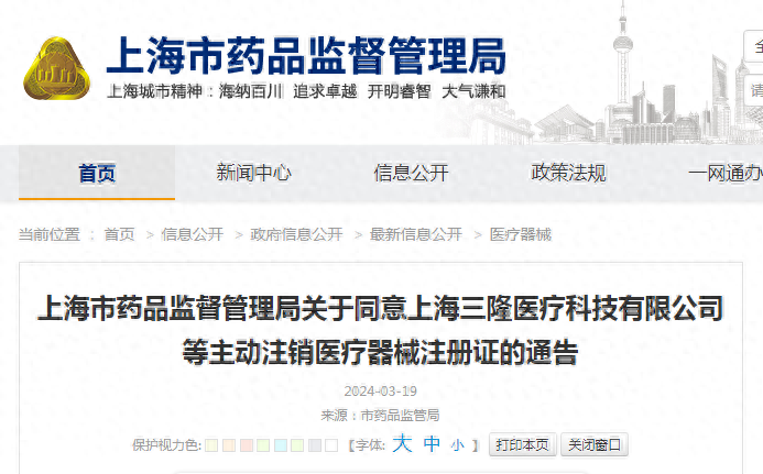 上海市药品监督管理局关于同意上海三隆医疗科技有限公司等主动注销医疗器械注册证的通告