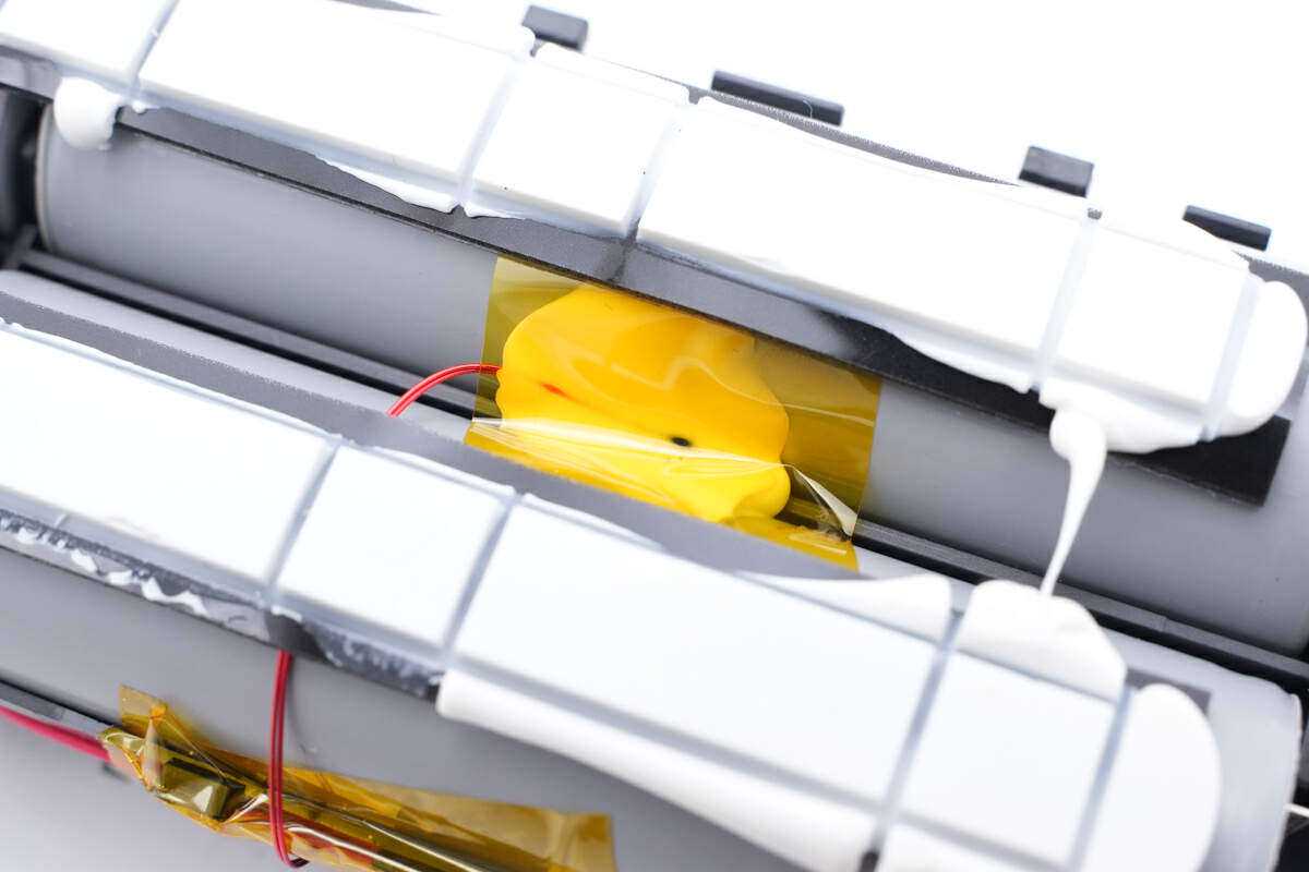 检测电池温度的热敏电阻特写,采用胶水固定。