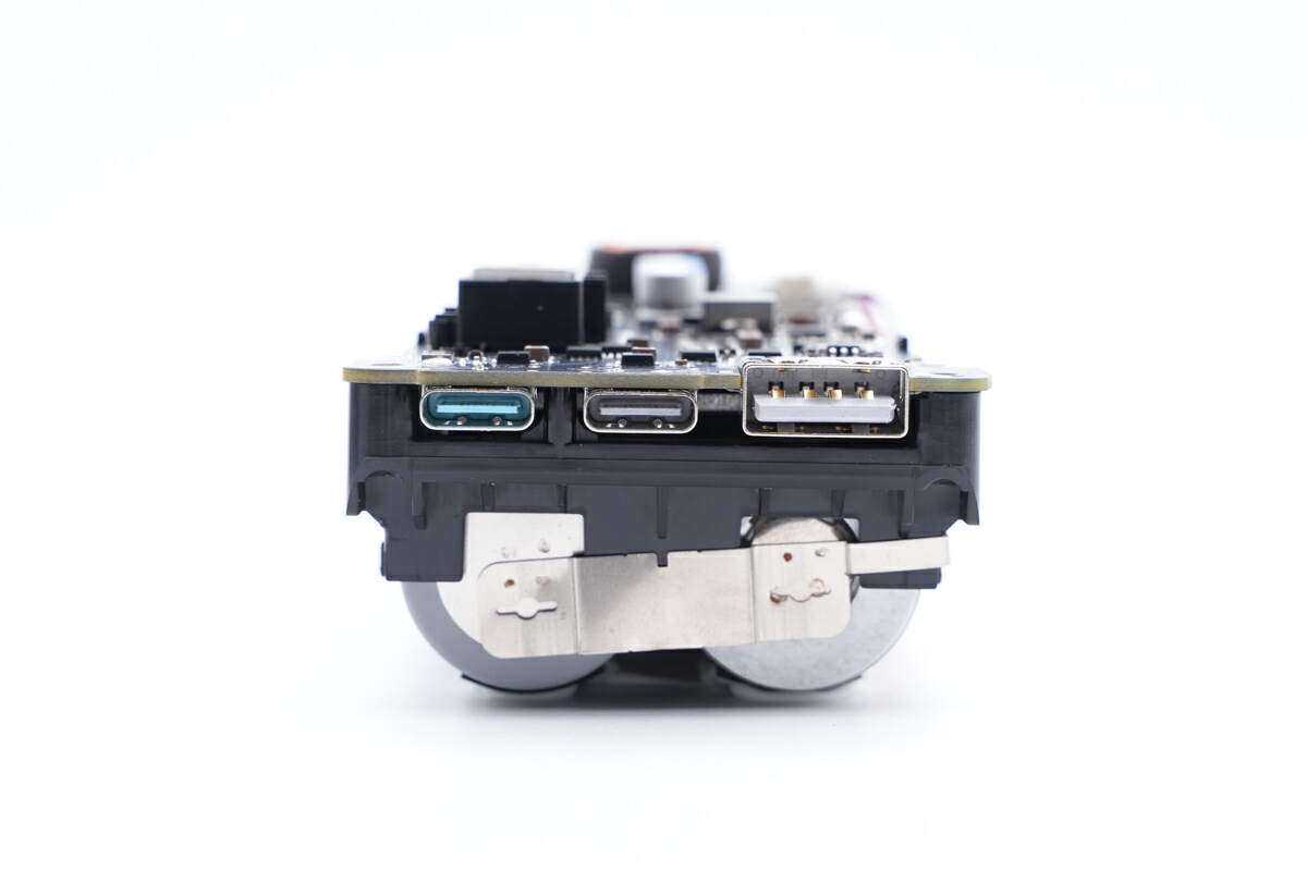 端面设置两个USB-C母座和一个USB-A母座,蓝色USB-C胶芯支持120W快充,USB-A母座为沉板设计,降低厚度。