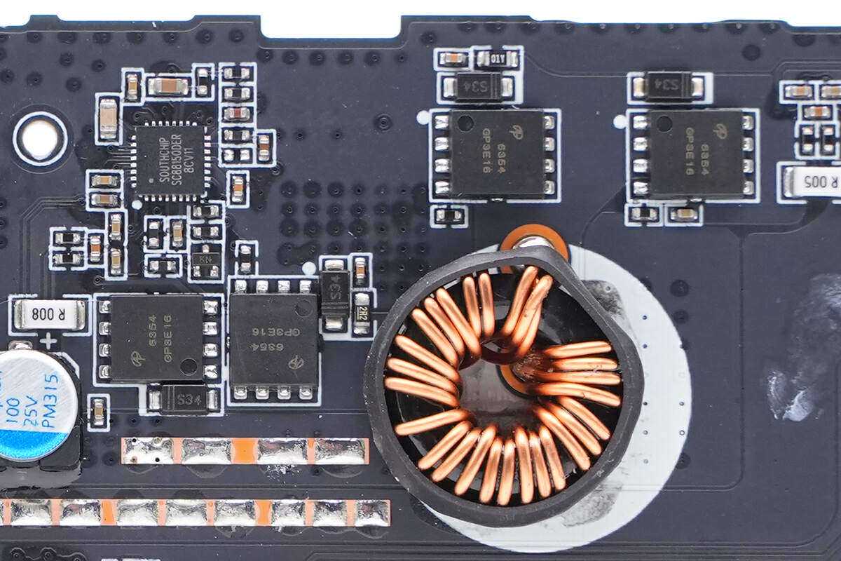 PCBA模块背面大面积露铜加锡散热,还焊接MLCC电容用于滤波,左侧焊接USB-C和USB-A母座。