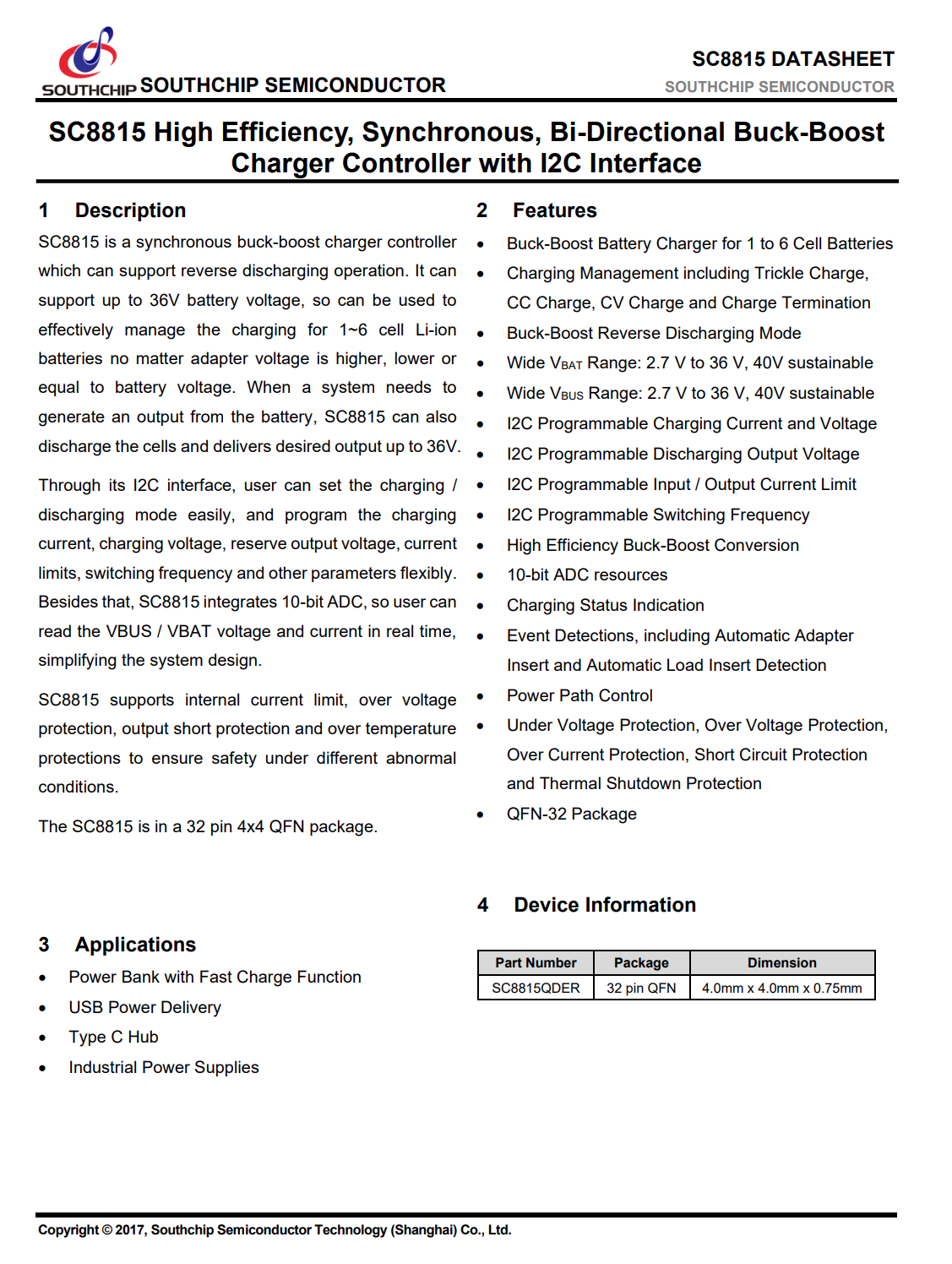 SC8721集成了I2C功能,方便客户使用控制芯片,用户可通过I2C配置输出电压,输出电流限流及开关频率。SC8721采用电流控制模式,支持输出电流限流,动态输出电压调整,内部电流限流,输出短路保护及过温保护,SC8721采用21pin4*4QFN封装。