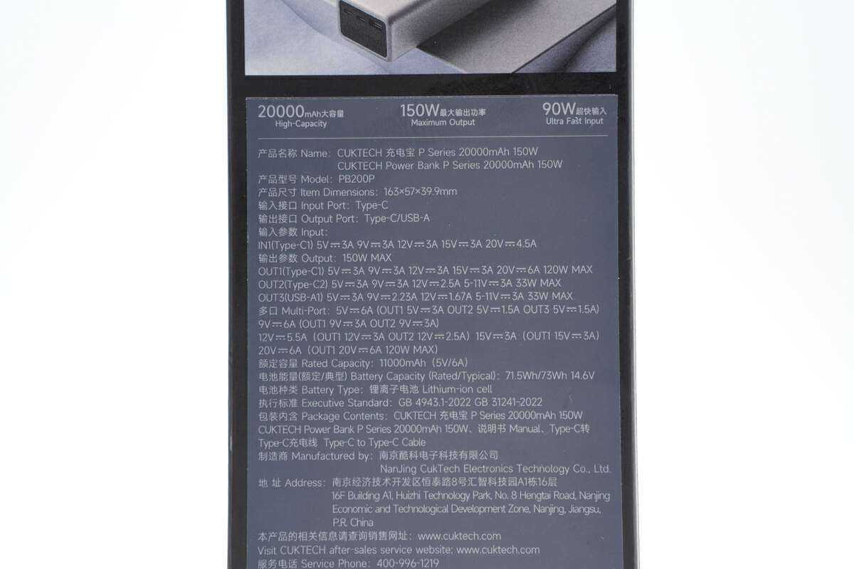 包装盒整体为灰色基调,正面印有产品名称、外观、150W、20000mAh以及PoweredbyCUKTECH。