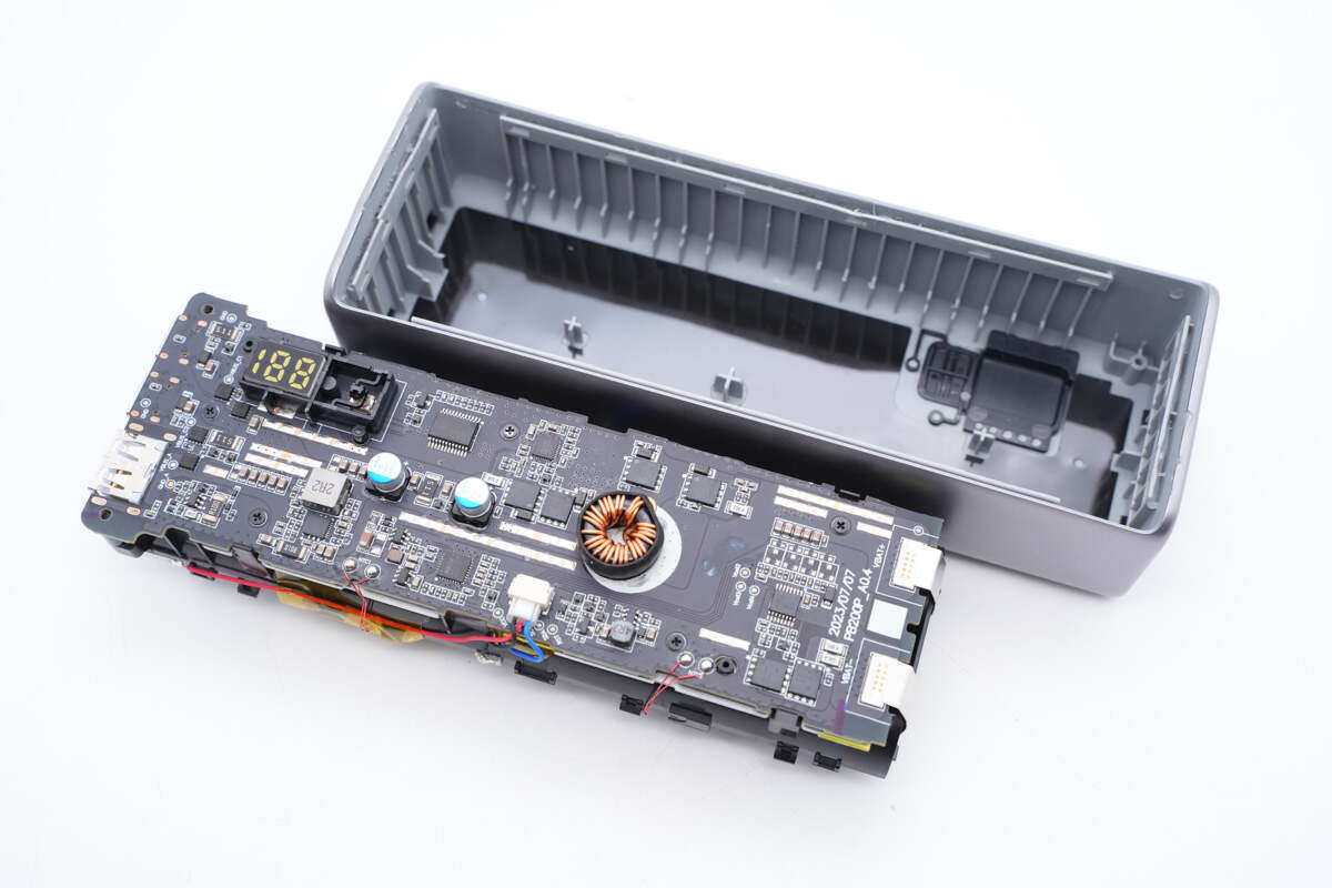 充电头网拆解总结酷态科15号电能柱内置20000mAh大容量电池组,总输出功率为150W,USB-C1接口支持120W输出和90W充电,USB-C2和USB-A口共享33W输出。机身采用长条柱状造型设计,采用PC防火材质外壳,外壳喷涂银灰色金属漆,整体美观时尚。并设有188LED数码管,用于电量百分比显示。