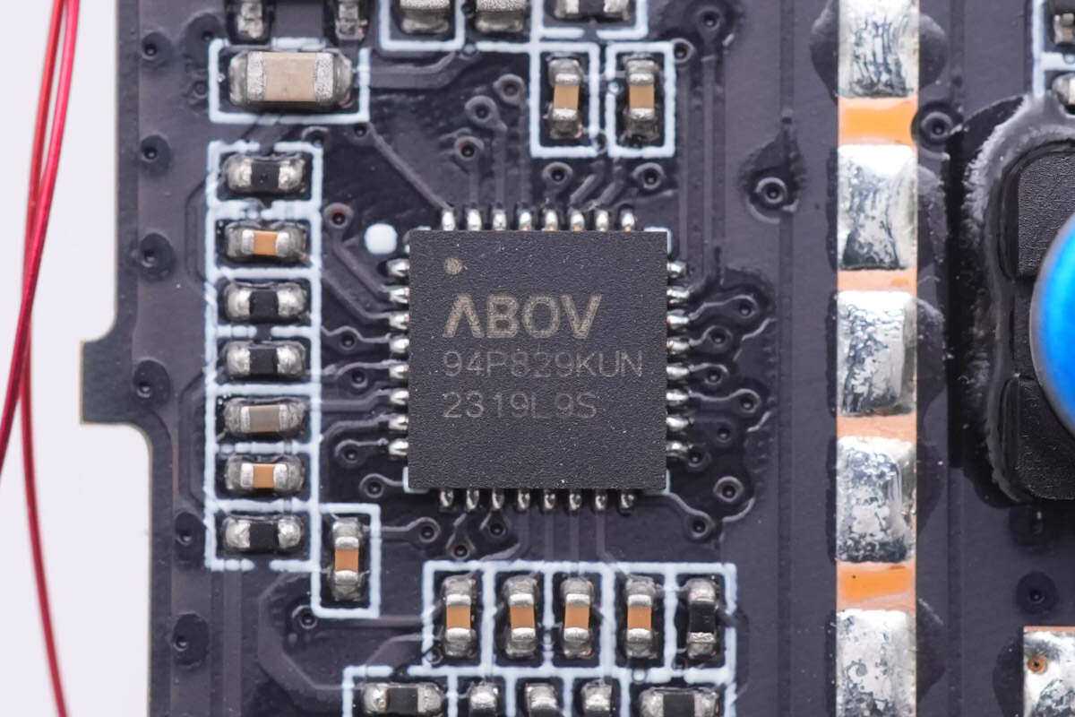 协议芯片来自ABOV现代单片机,型号A94P829,是一颗支持的协议芯片,支持两个USB-C接口和一个USB-A接口。芯片内置8051内核,快充协议支持广泛。