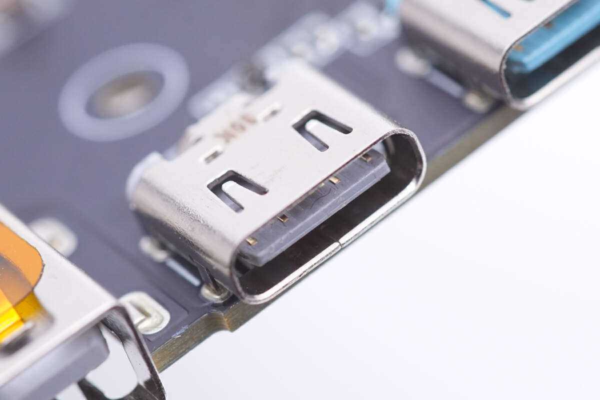 USB-C2母座采用白色胶芯,过孔焊接固定。