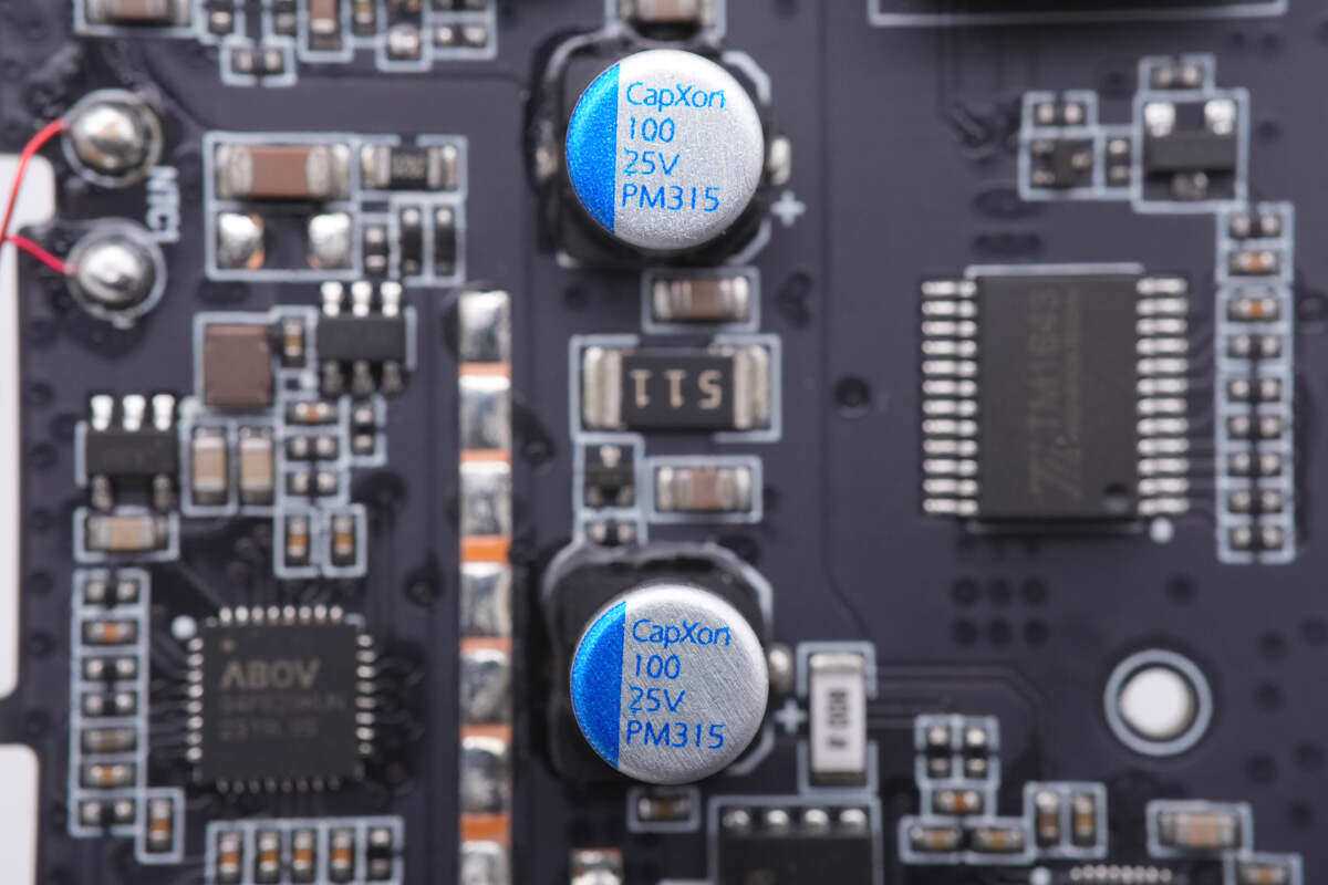 用于USB-C1接口的两颗滤波电容来自丰宾,PM系列小型化固态电容,规格为100μF25V,两颗并联,打胶固定。
