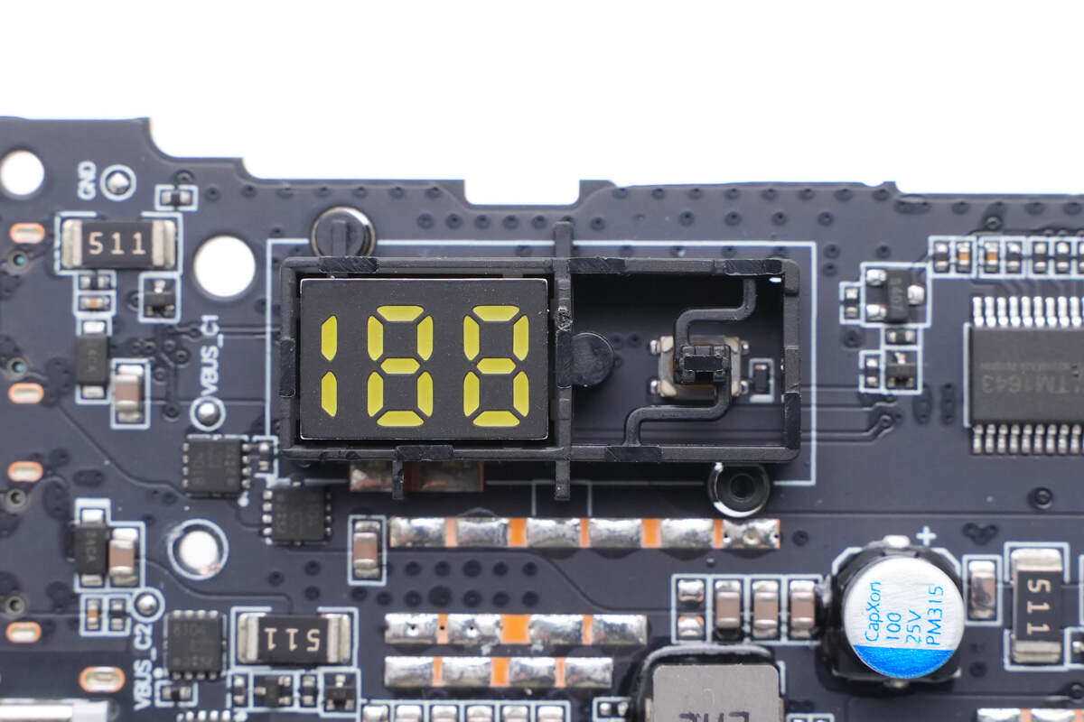 PCBA模块正面一览,左侧焊接USB-C和USB-A接口,依次焊接188LED数码管,电量检测按键。在显示屏下方焊接一颗同步升降压转换器和合金电感。右侧焊接屏幕驱动芯片,同步升降压控制器,同步升降压开关管和磁环电感。最右侧焊接电池保护芯片和电池保护管。