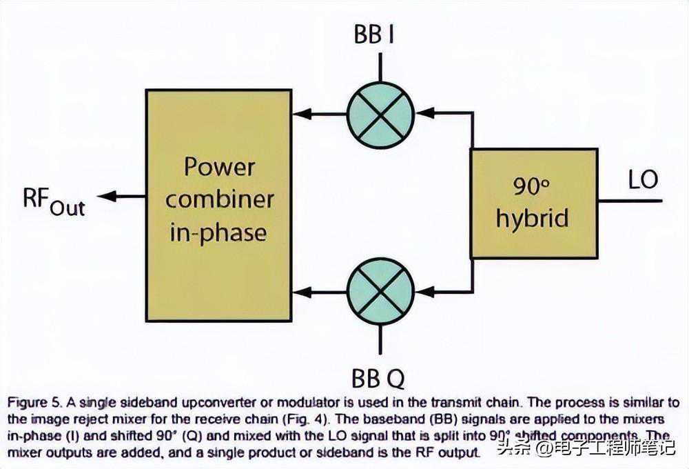 图5:单边带上变频器或调制器用于发射信号链中。此过程类似于接收信号链的镜像抑制混频器(图4)。基带(BB)信号被施加到同相(I)和90°相移(Q)混频器,并与分成90°相移分量的LO信号进行混频。增加了混频器输出,单个产物或边带为RF输出。