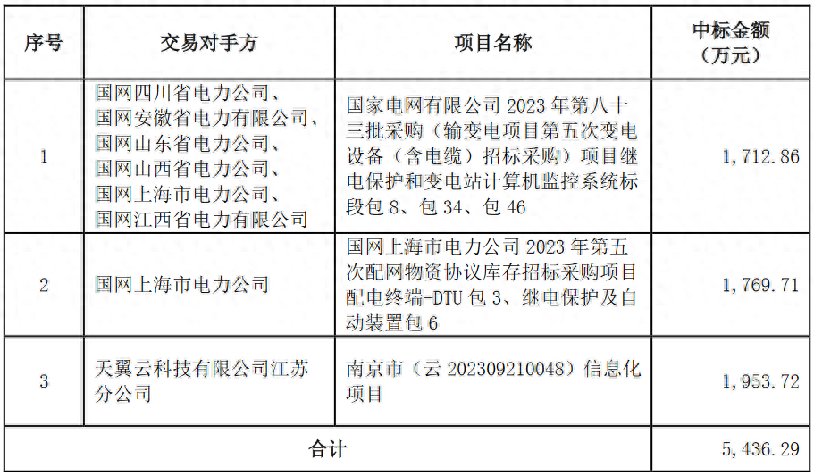 金智科技(002090)于11月14日发布晚间公告称,近日,江苏金智科技股份有限公司(以下简称“公司”)在国家电网有限公司2023年第八十三批采购(输变电项目第五次变电设备(含电缆)招标采购)项目(招标编号:0711-230TL11111050)中中标1,712.86万元,在国网上海市电力公司2023年第五次配网物资协议库存招标采购项目(招标编号:2309-GK019)中中标1,769.71万元;公司全资子公司江苏东大金智信息系统有限公司成功中标南京市(云202309210048)信息化项目(项目编号:JSZB-2023-15176),中标金额为1,953.72万元。具体情况如下: