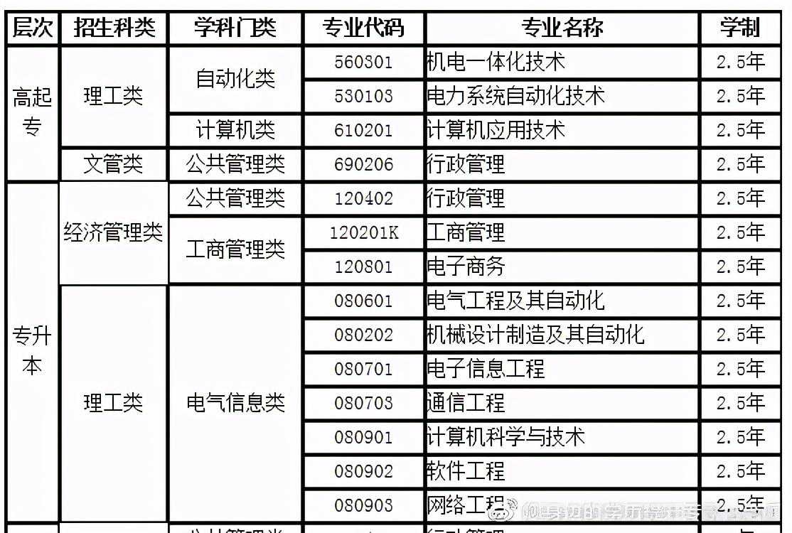2021年春季高等专科起点本科(简称专升本)层次设置招生专业39个。