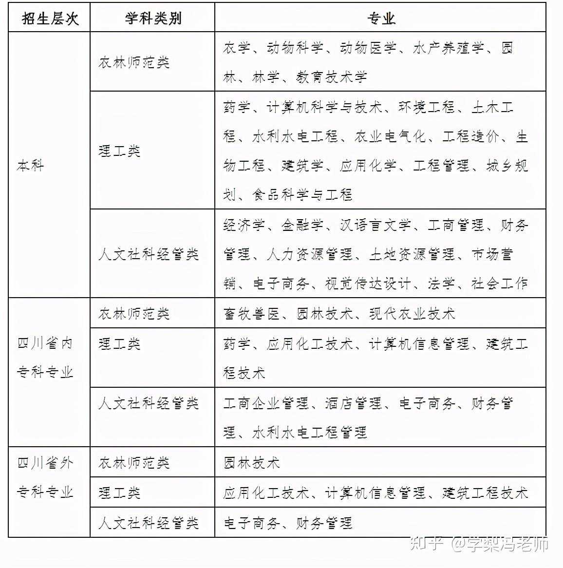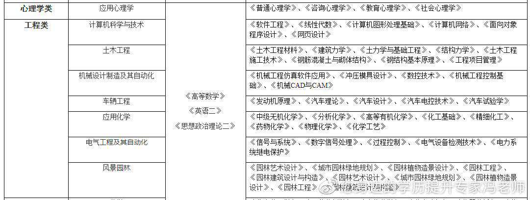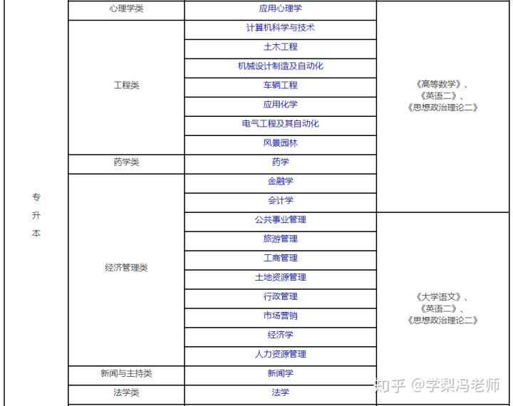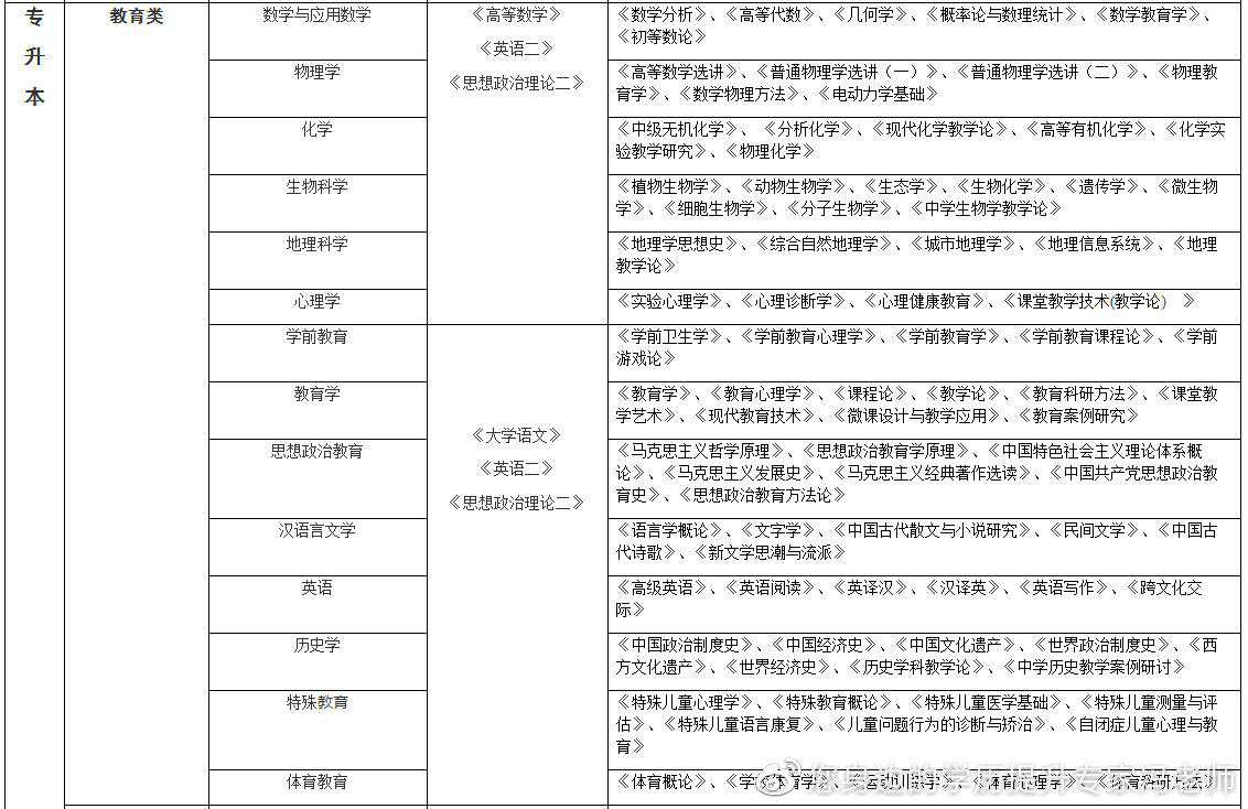 [专升本]数学与应用数学、物理学、化学、生物科学、地理科学、心理学、学前教育、教育学、思想政治教育、汉语言文学、英语、历史学、特殊教育、体育教育、应用心理学、计算机科学与技术、土木工程、机械设计制造及其自动化、车辆工程、应用化学、电气工程及其自动化、药学、金融学、会计学、公共事业管理、旅游管理、工商管理、土地资源管理、行政管理、市场营销、经济学、人力资源管理、新闻学、法学、园林、园艺、农学、动物医学