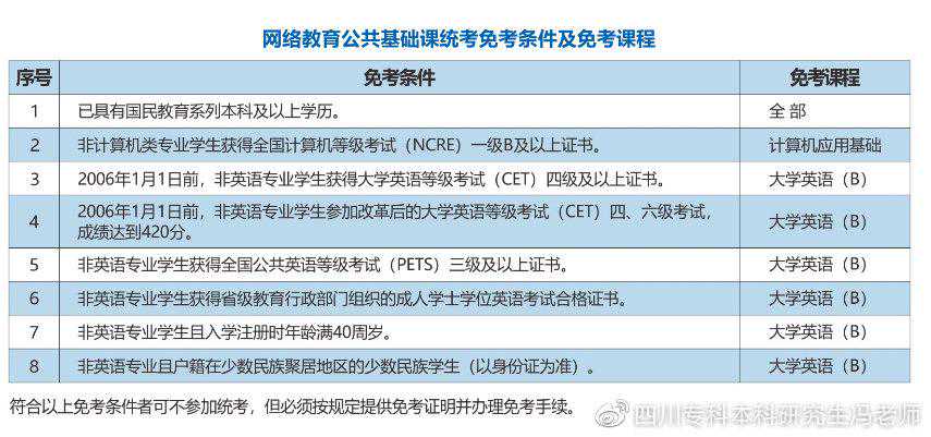 关于统考免考的规定:已具有国民教育系列本科以上学历(含本科),可免考全部统考科目;除计算机类专业学生外,获得全国计算机等级考试一级B或以上级别证书者可免考“计算机应用基础”;除英语专业学生外,获得大学英语等级考试(CET)4级或以上级别证书者(注意:2006年1月1日后大学英语四、六级考试将不再作为统考“大学英语”免考的条件。)、全国公共英语等级考试(PETS)三级或以上级别证书者、省级教育行政部门组织的成人教育学位英语考试合格证书者,可免考“大学英语B”;在入学注册时年龄满40周岁的非英语专业学生,可免考“大学英语B”;除英语专业考生外,户籍在少数民族聚居地区的少数民族学生,可免考“大学英语B”。