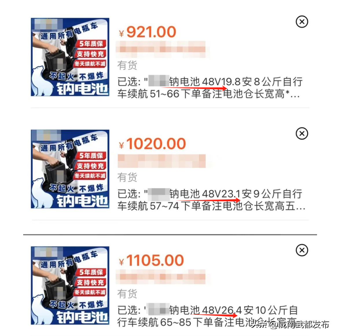首先来看来自第一组品牌的钠电池,它销售的都是4块电池的48V,带有19.8AH,23.1AH,26.4AH这3种容量,价格分别是921元、1020元,1105元。