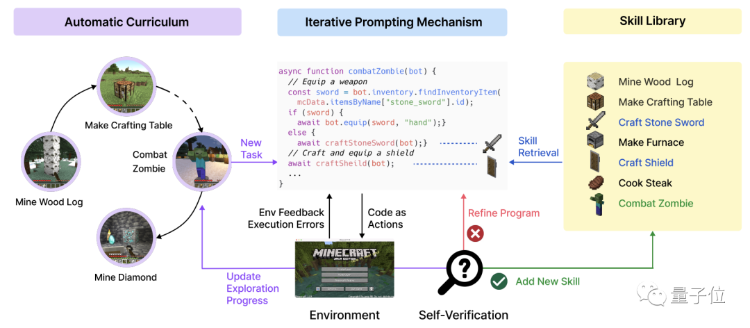 如何实现Voyager主要由三部分组成,即自动任务生成系统、技能库和迭代提示机制。