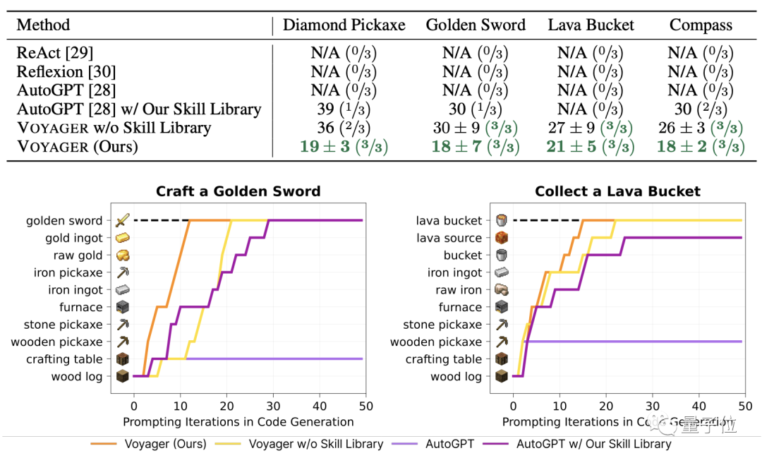 深度广度双双提升团队将Voyager的表现与ReAct、Reflexion和AutoGPT进行了对比。