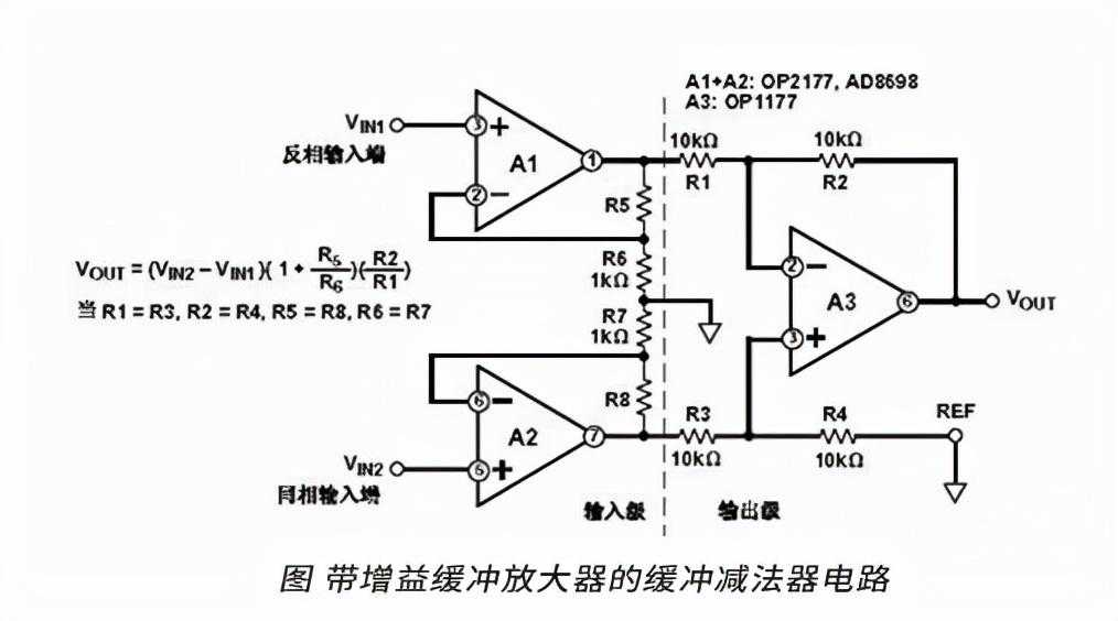 输出电压表达式如上图所示。上图所示的电路增加增益(A1和A2)时,它对差分信号增加相同的增益,也对共模信号增加相同的增益。也就是说,上述电路相对于原电路共模抑制比并没有增加。