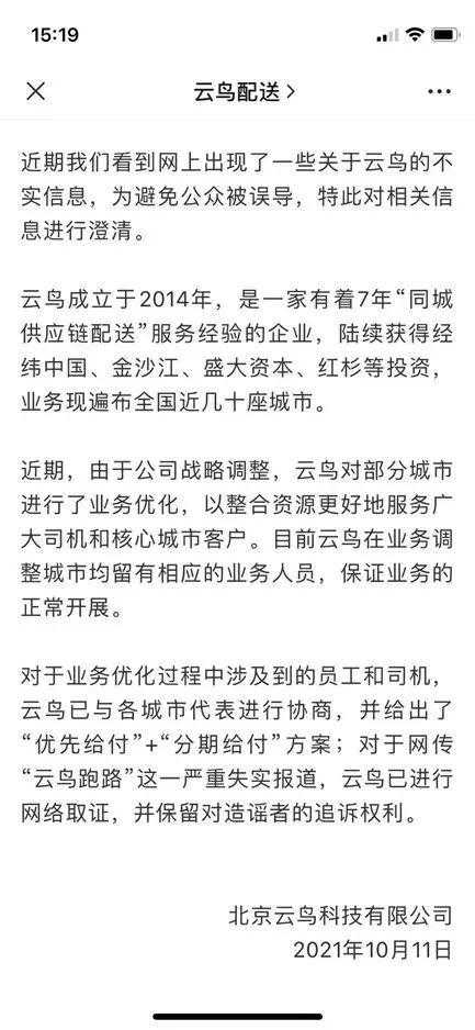 值得一提的是,云鸟科技在10月11日时还曾针对跑路传闻辟谣。公司方面称,由于战略调整,云鸟对部分城市进行了业务优化,对于业务优化过程中涉及到的员工和司机,云鸟已与各城市代表进行协商,并给出了“优先给付”+“分期给付”方案。