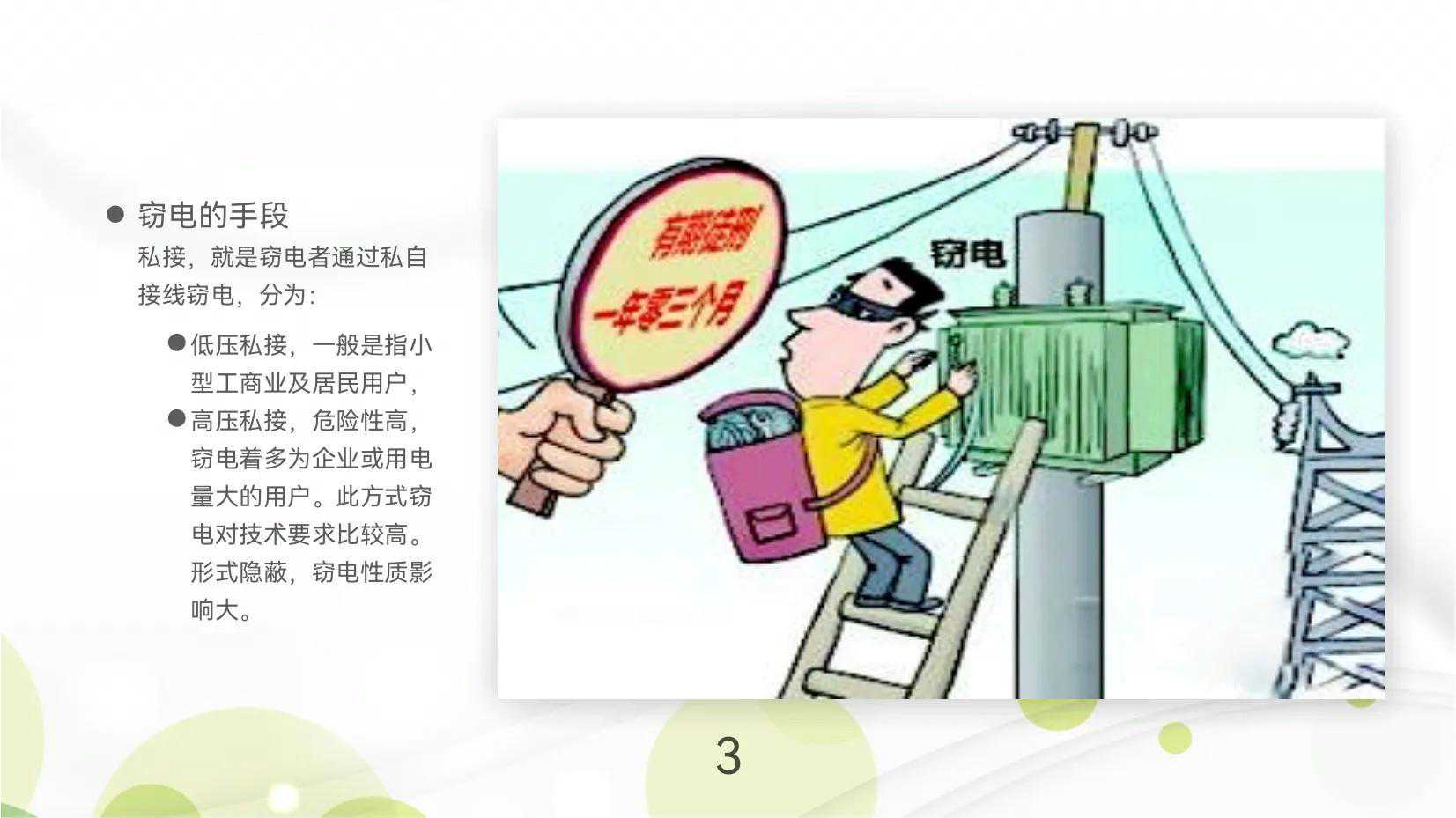 窃电的手段私接,就是窃电者通过私自接线窃电,分为:低压私接,一般是指小型工商业及居民用户,高压私接,危险性高,窃电着多为企业或用电量大的用户。此方式窃电对技术要求比较高。形式隐蔽,窃电性质影响大。