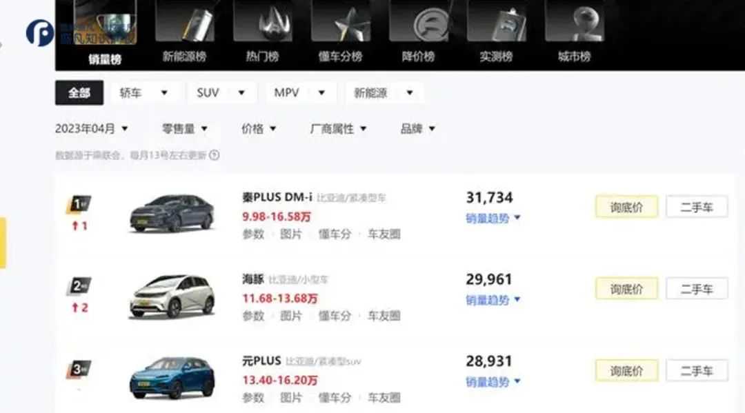 根据2023年4月的销量数据来看,比亚迪秦PLUSDM-i在4月售出31734辆,宋PLUSDM-i在4月售出20645辆,均在销量榜前列。
