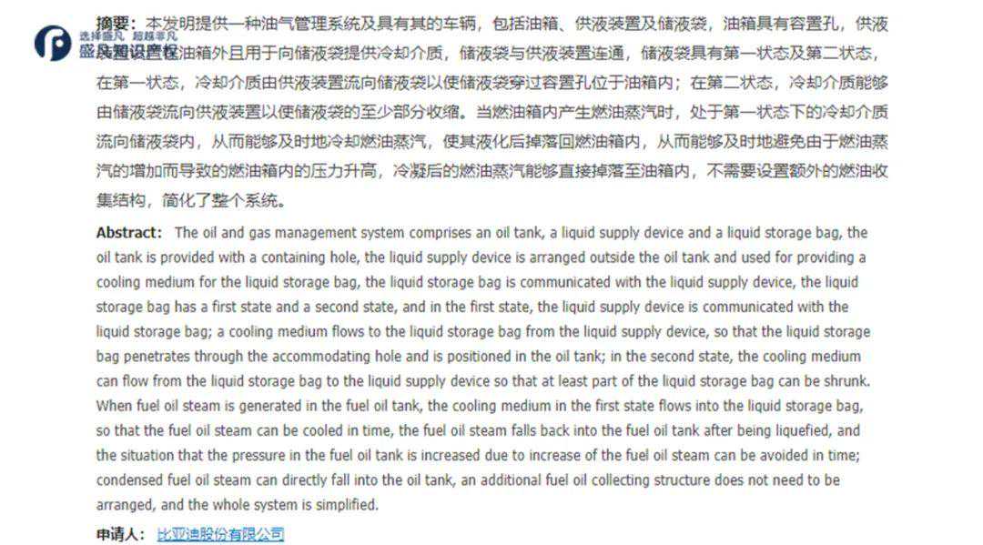 “黑科技”能否解决问题?盛凡通过检索专利信息,发现比亚迪曾在2021年提出专利申请,名为"油气管理系统及具有其的车辆",专利号202110340830.9。