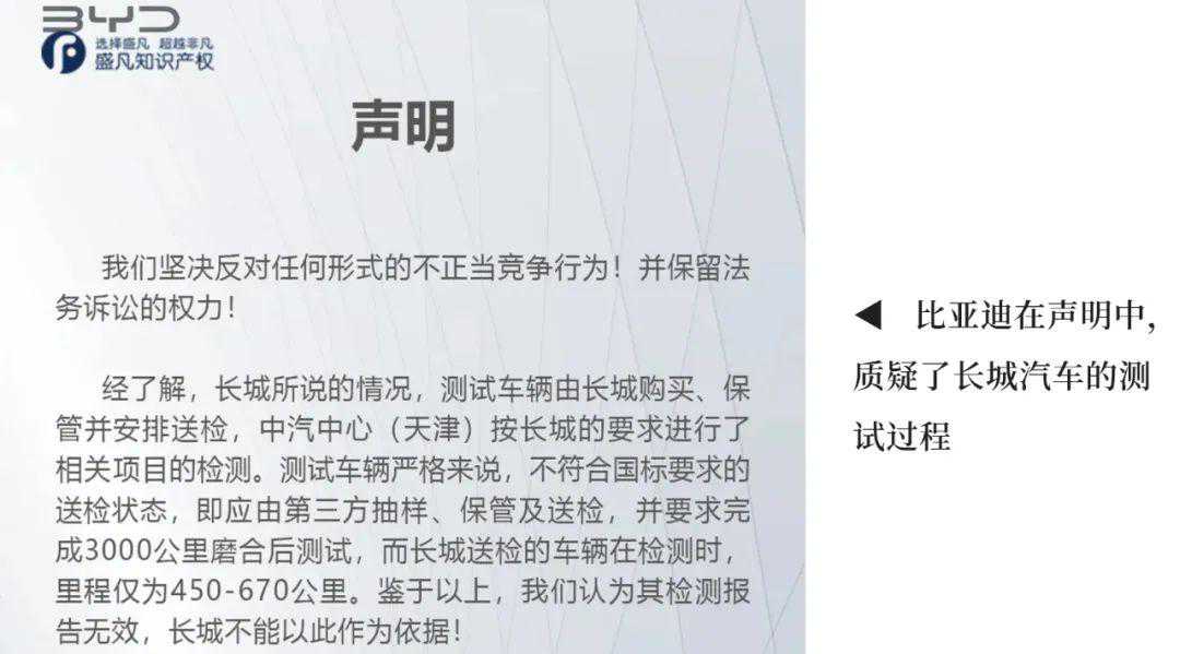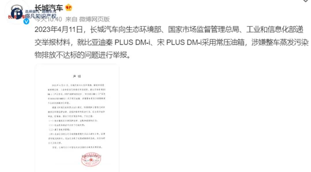 2天后,长城汽车在无征兆的情况下发表声明:“向生态环境部、国家市场监督管理总局、工业和信息化部递交举报材料,就比亚迪秦PLUSDM-i、宋PLUSDM-i采用常压油箱,涉嫌整车蒸发污染物排放不达标的问题进行举报。”
