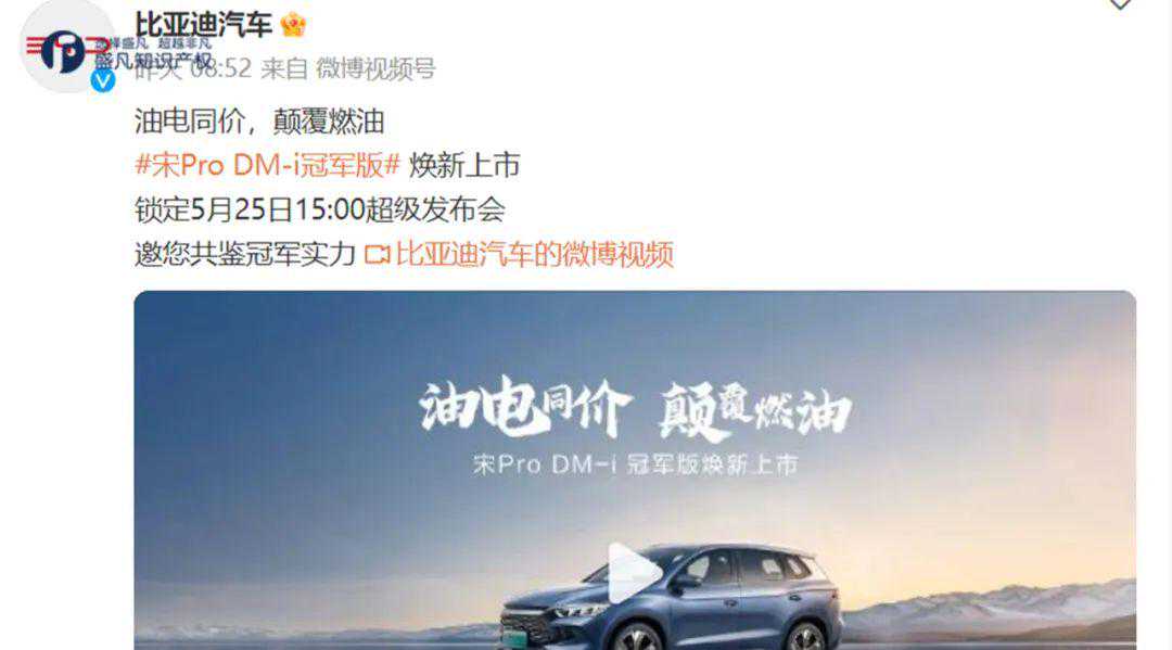 5月23日,“比亚迪汽车”微信公号发布了“宋ProDM-i冠军版”上市倒计时2天的宣传资料。